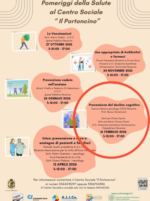 Incontro gratuito sulla prevenzione del declino cognitivo nell’anziano 16 febbraio dalle 15:00 alle 17:00 Centro Sociale “Il Portoncino”Via Portoncino, 4 – RavennaUn’occasione per ricevere consigli pratici e informazioni utili per mantenere la mente attiva e in salute. Info e iscrizioni: 0544 218297 – 335 6754306#SalutePerTutti #Eventi #PromozioneDellaSalute #prevenzioneattivaVi aspettiamo! Lascia una rispostaCancella rispostaIl tuo indirizzo email non sarà pubblicato. I campi obbligatori sono contrassegnati * Nome * Email * Sito web Aggiungi commento * Save my name, email and website in this browser for the next time I comment.Invia commento